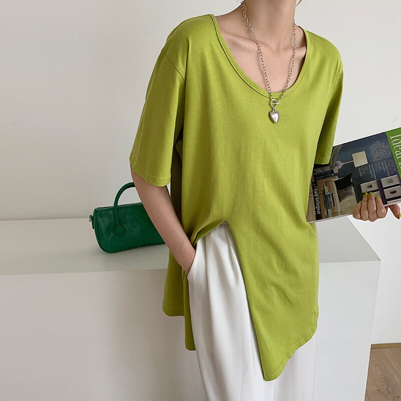 设计感时尚开叉短袖t恤女2021新韩版宽松爽滑棉质感高级百搭上衣热门设计联盟服务商