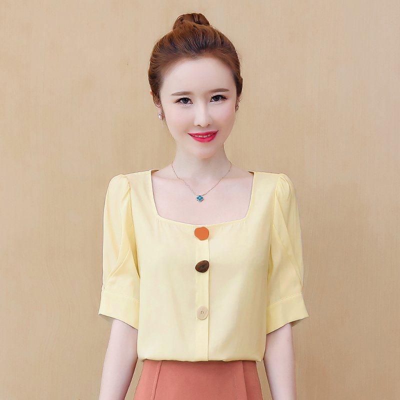 泡泡袖方领上衣女设计感小众轻熟2021N新款夏季法式雪纺衫短袖衬热门设计联盟服务商